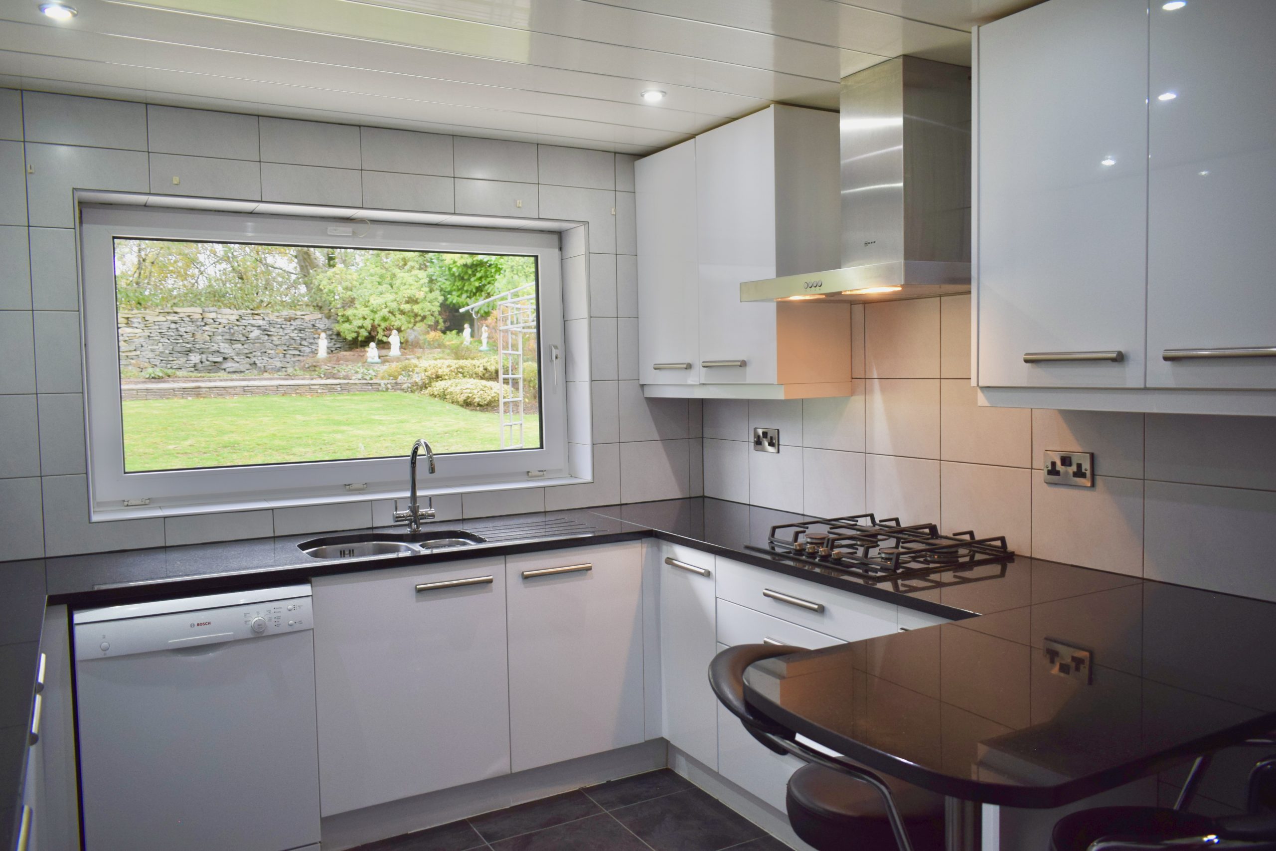 Modern Kitchen with breakfast bar, fully integrated NEFF double electric oven, under counter fridge, dishwasher, 4 ring gas hob and extractor hood, and separate utility room adjacent with integrated large freezer & sink, and door access to the rear flagged terrace area