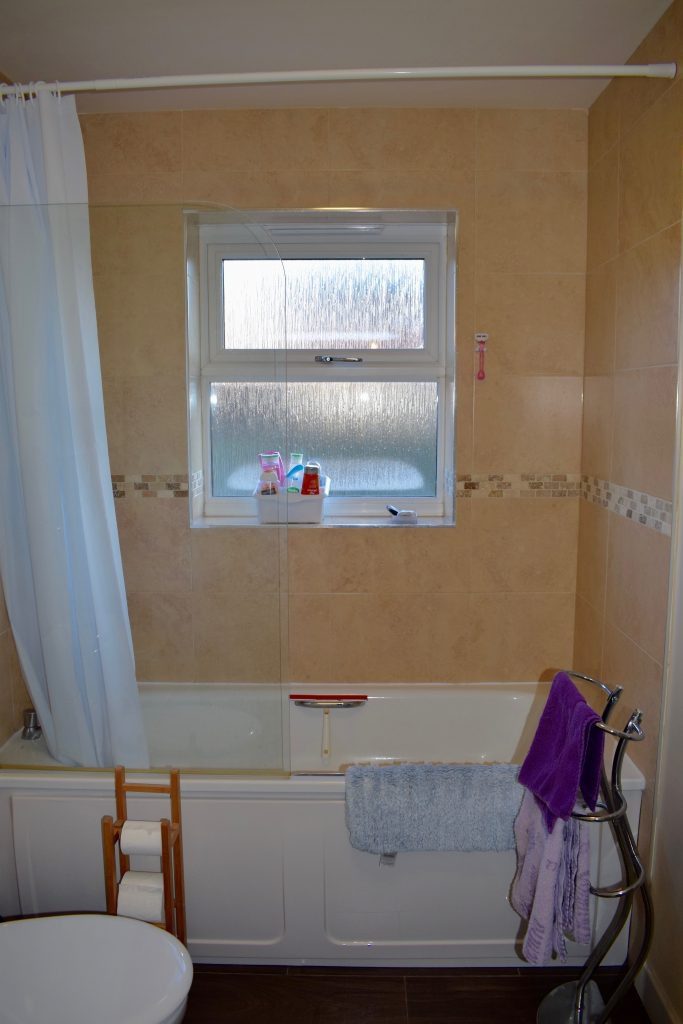 Modern Family Bathroom, with shower over bath, pedestal sink and WC, wood laminate floor