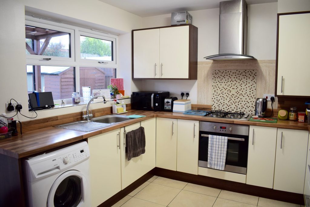 White tiled floor to modern dining kitchen, with integrated electric cooker, gas hob and extractor hood (views to rear garden)